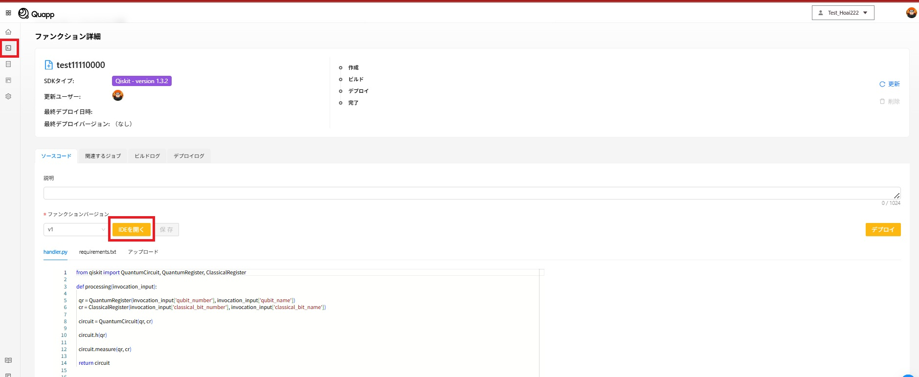 ・「IDEを開く」 を選択し、IDE画面を表示します。