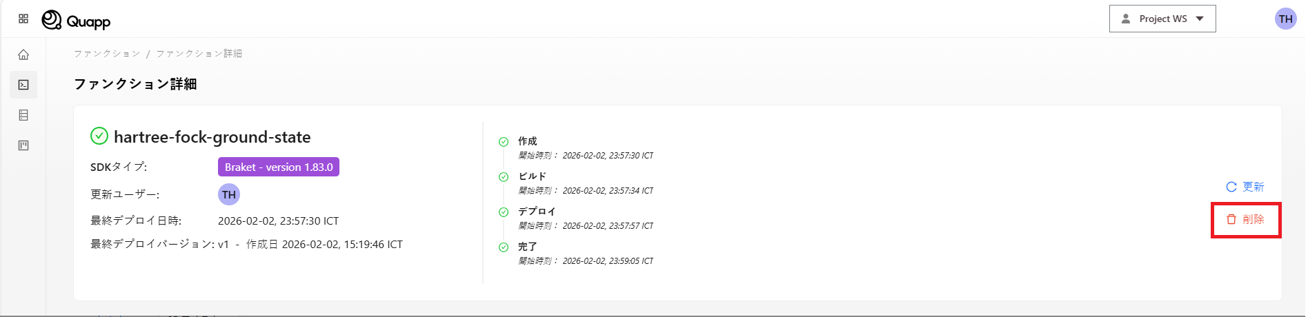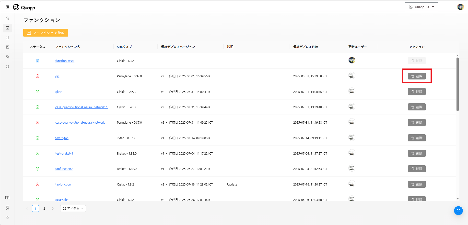 一覧右側の「アクション」列にある、対象ファンクションの「削除」ボタンをクリックします。