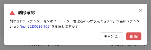 - 削除したファンクションは、プロジェクト管理者が復元操作をしない限り、元に戻せません。