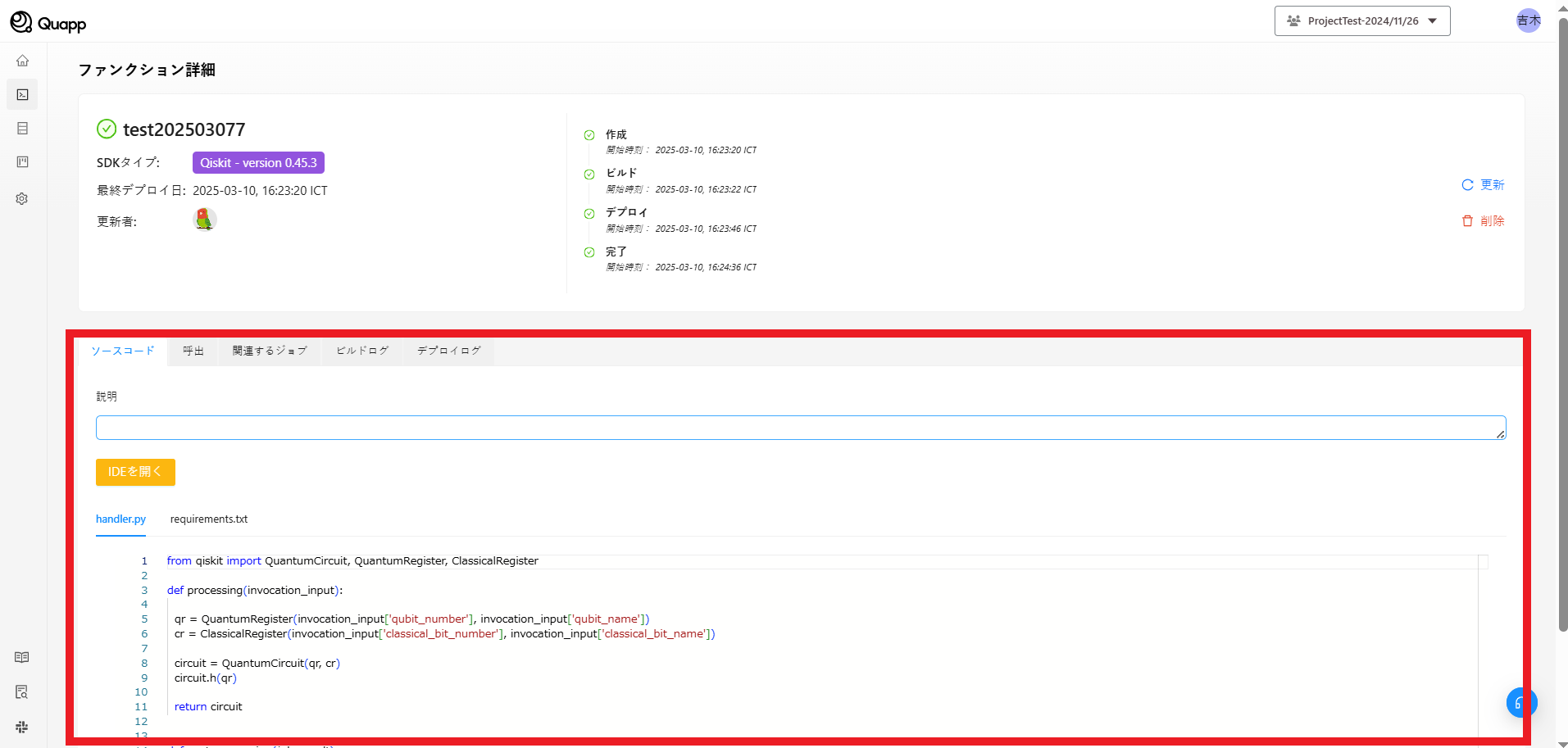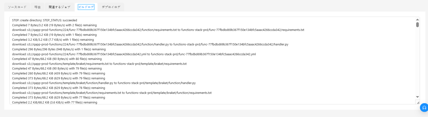 - ビルドログ:ファンクションのビルド時のログを確認することができます。