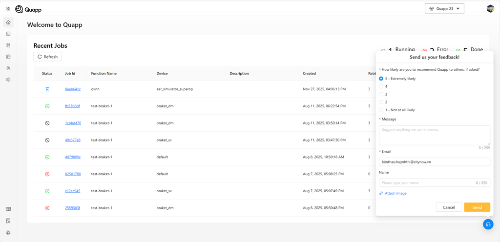 User feedback helps improve the Quapp platform. Quapp provides a built-in feedback form that allows users to share suggestions, report issues, and rate their overall experience.